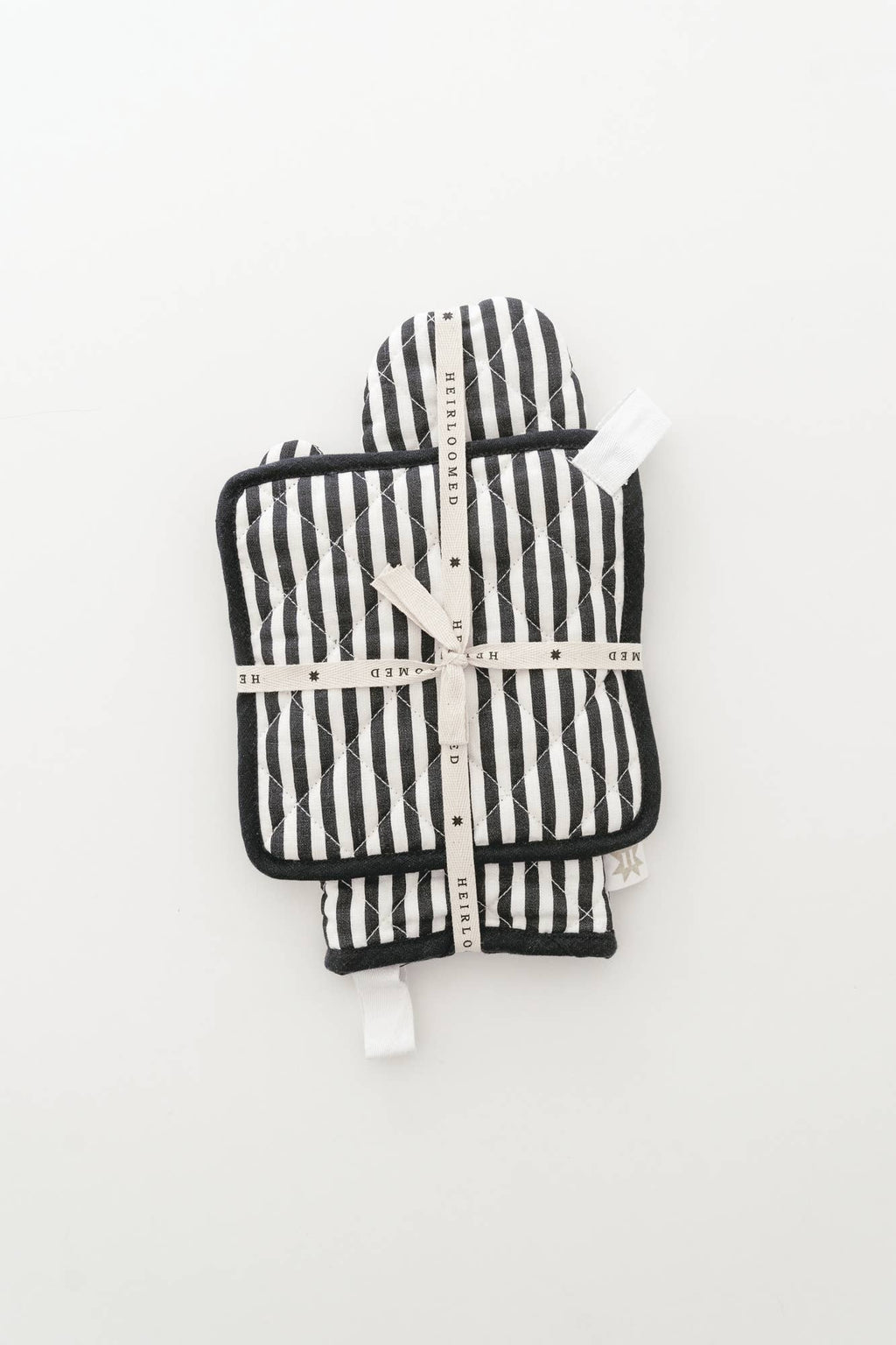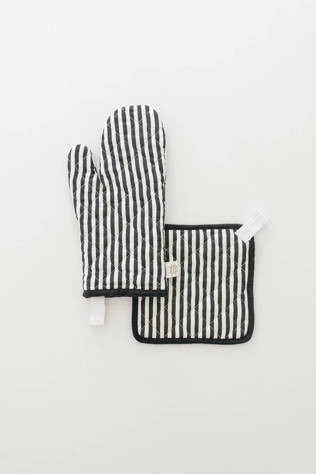 Each set features a striped oven mitt and a double sided pot holder that features a solid color on one side with a stripe color on the other.