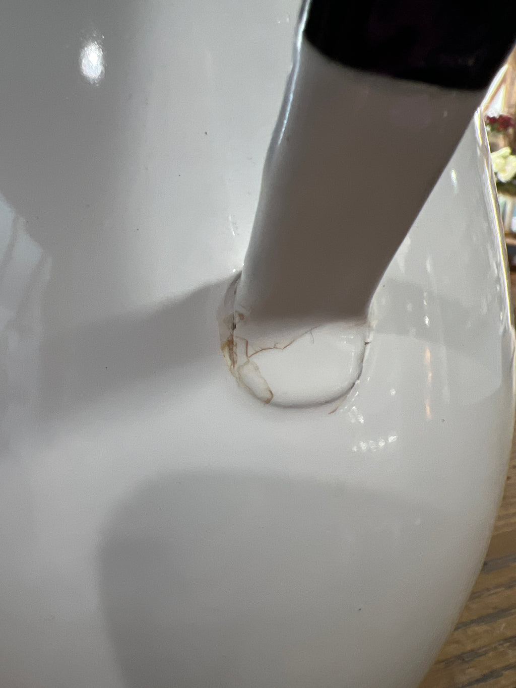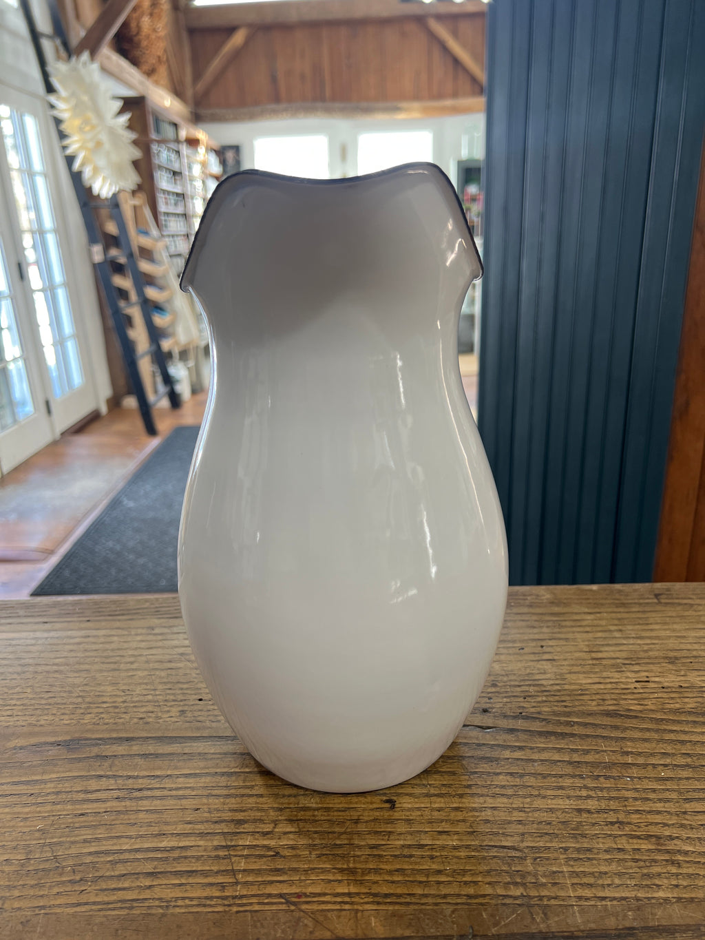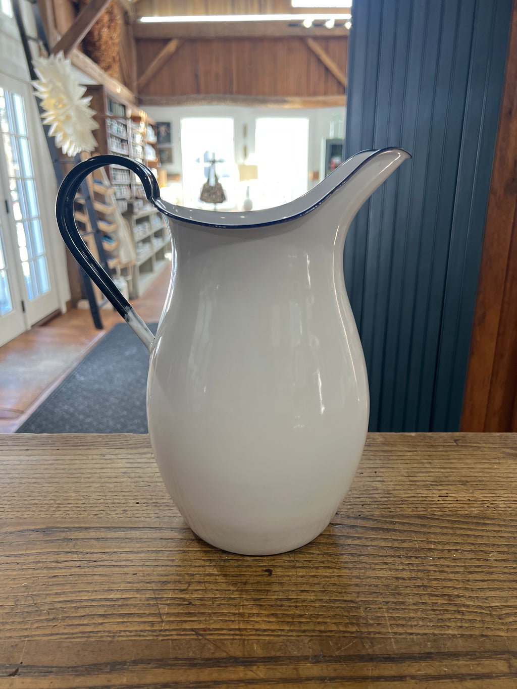 11” Tall x 9.75” Wide Enamelware Pitcher with Cobalt Blue trim and Black handle…Made in Sweden… A few small cracks near bottom of handle… See pictures!