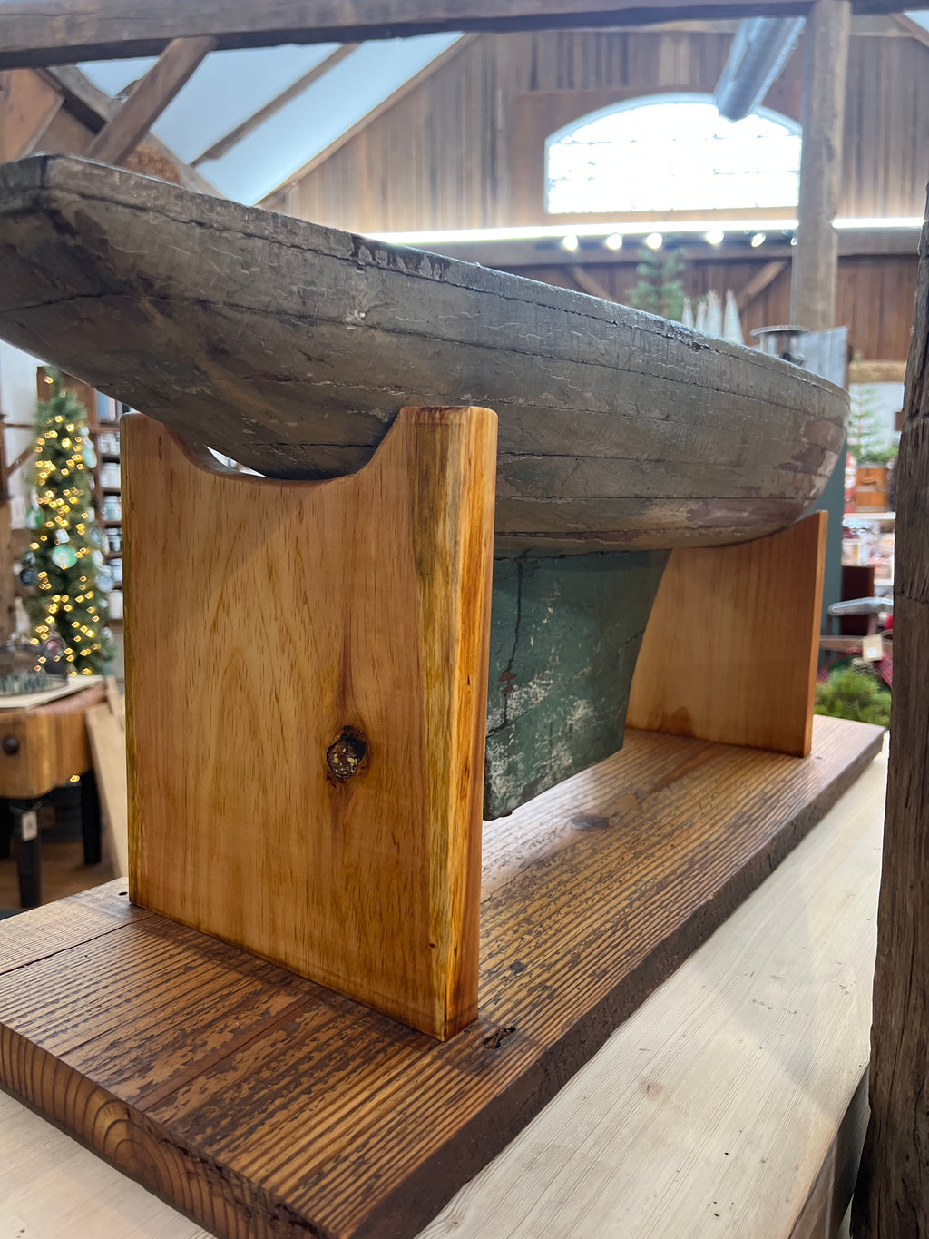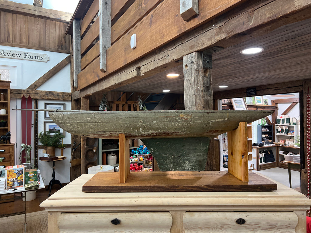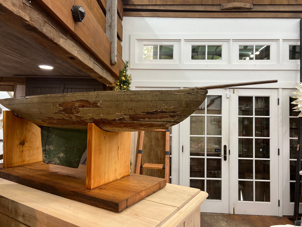 51.25” Long x 14.5”Tall Including Stand x 9.75” Wide… There is worn paint and patina on this Antique Pond Hull….Original Green paint makes this a great conversation piece. Certainly one-of-a-kind!