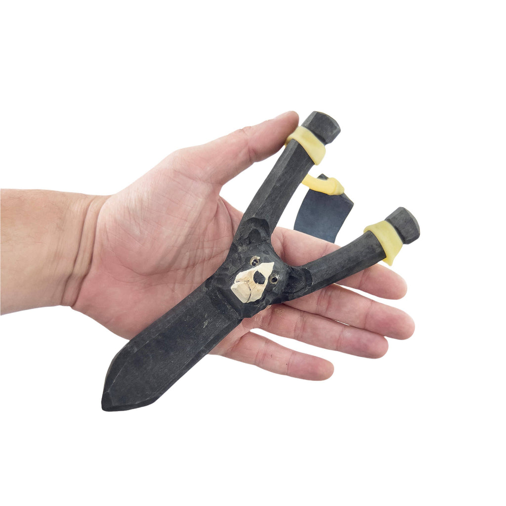 Each one-of-a-kind slingshot is hand-carved from wood in the likeness of a powerful wild beast, and outfitted with a leather projectile pouch using natural latex tubing.