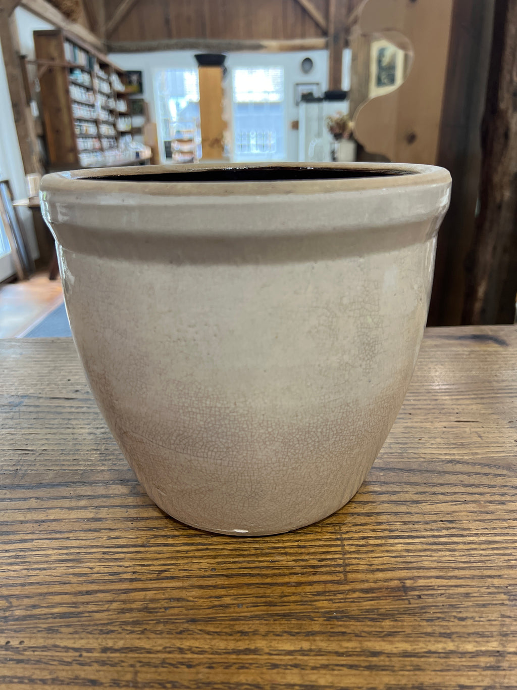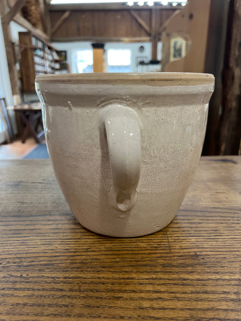 Stoneware Crock 7.5” High and 8.5” Diameter.  With hand shaped handle.  Nice patina, brown on inside.… Sturdy piece!  See pics for condition.