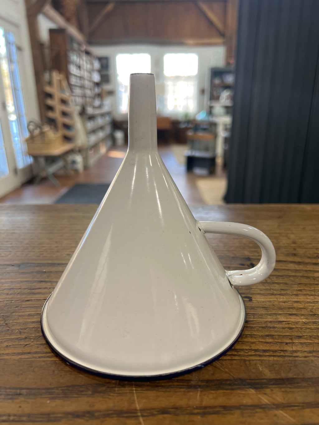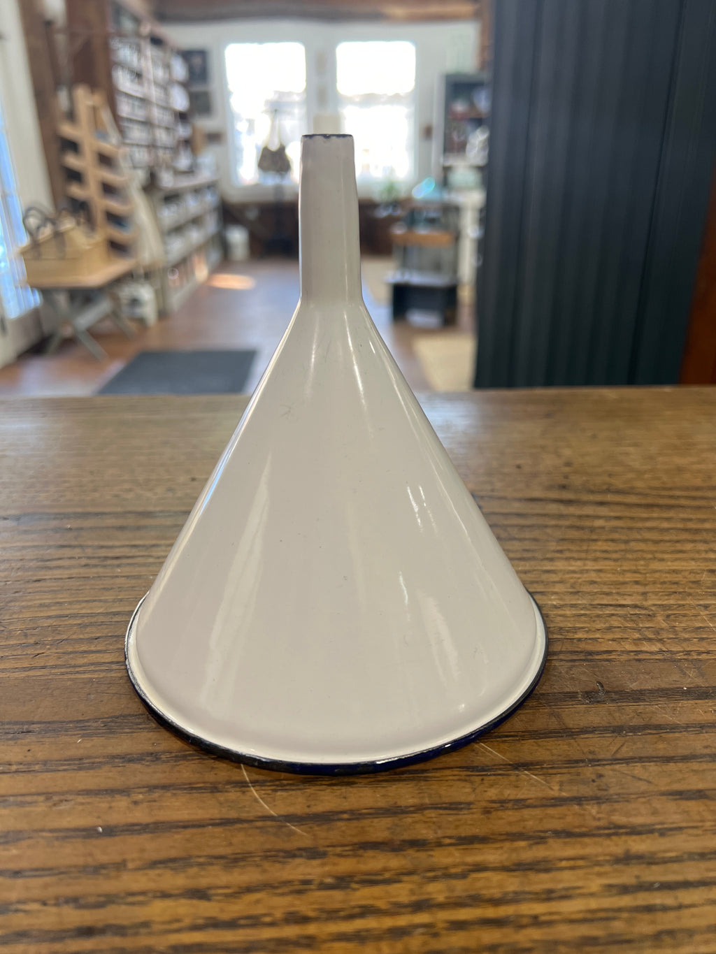 Vintage White Enamelware with Blue Trim Funnel