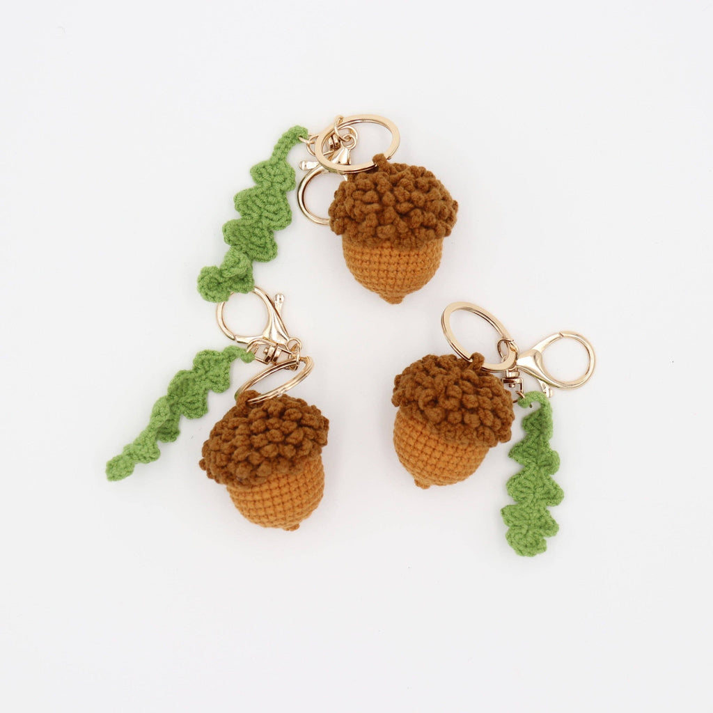 This hand-knitted acorn keychain is a cozy nod to woodland whimsy, featuring a warm brown base and a textured cap stitched with care.