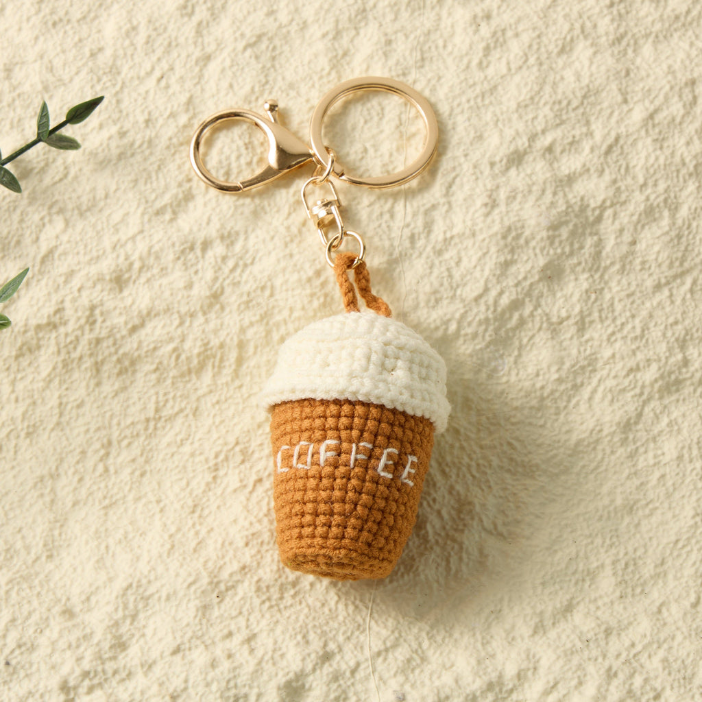"Add a touch of spring to your everyday accessories with our delightful hand-knitted coffee cup keychain!